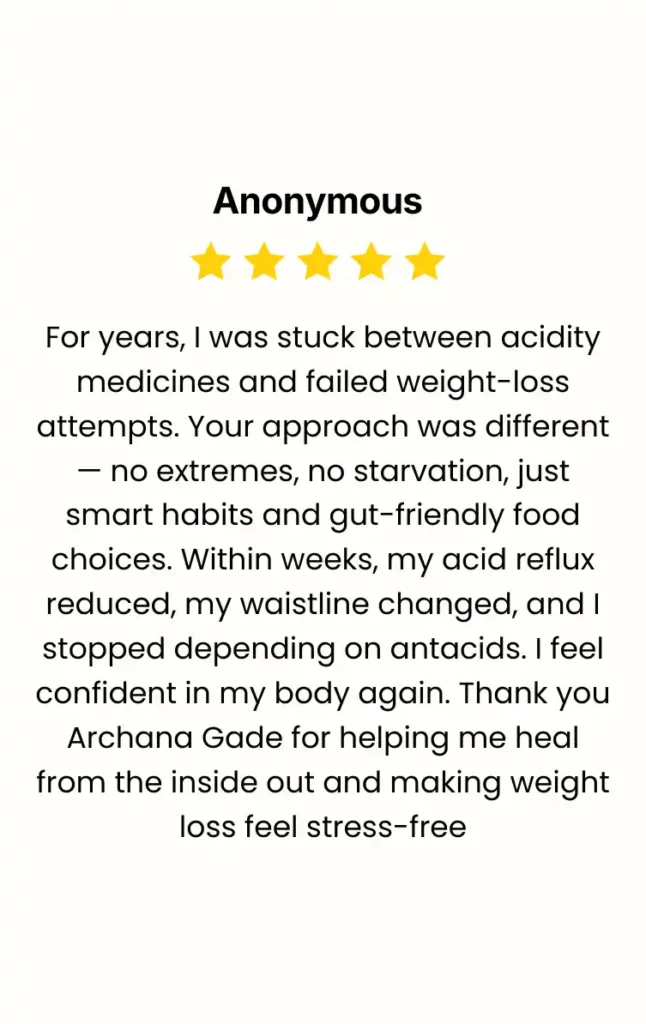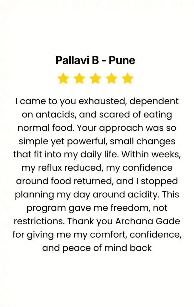 You’ll get clarity on your hidden food triggers, eating schedule mistakes, lifestyle habits, and daily routines that silently worsen reflux, bloating, and burning without you realizing it.